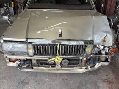 PY30 セドリックワゴン 単独事故 三島 旧車 ネオクラ バンパー・ボンネット・左フェンダー・ライト交換・サイドメンバー・サポート・フードレッジ修正
