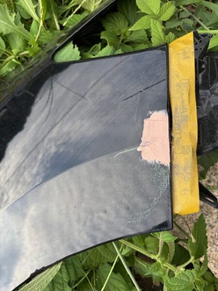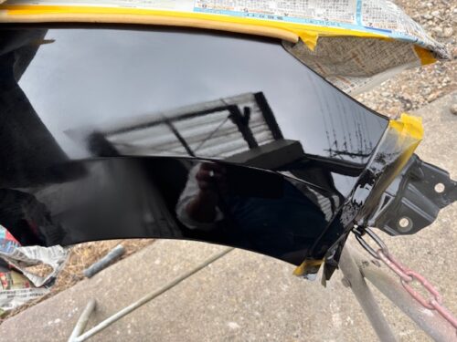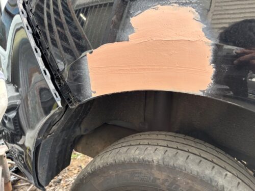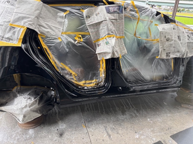 接合箇所とクォーターパネルの鈑金を平行します、室内は汚さぬようきちんと養生します。