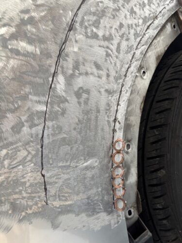 板金パテ、薄付けパテからライン出しです、根気勝負です。この後もう一度薄く目消しの為パテを付けます。だいたい1日で最初からこの辺り迄です。
