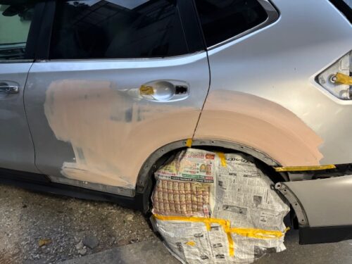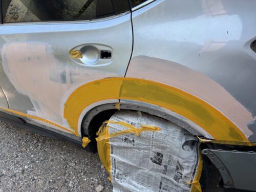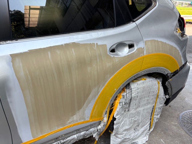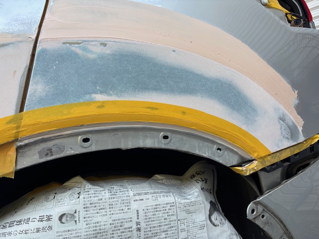 全体にラッカーパテを塗りさらにマスキングにてライン出ししようやく塗装工程です、今回はかなり塗料が乗る為前から後ろ迄片側吹きとしました。工期3日金額22万です。他店での交換作業で高額見積もりを取られてお困りの方御相談下さい、鈑金で少しは金額を抑えることが出来るかもしれません。ちゃんとメリットデメリットも説明いたします。