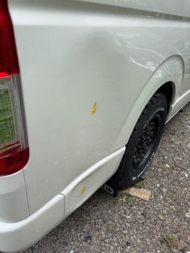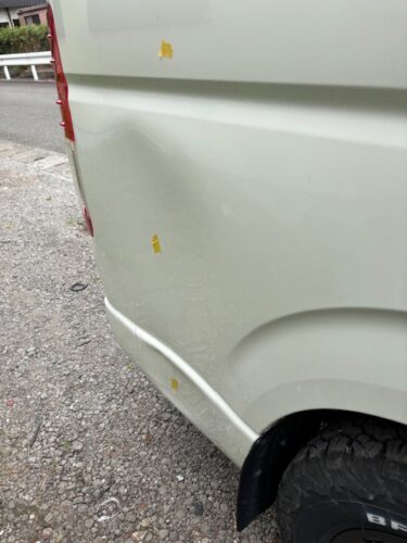 バックでポールにぶつけたパターンでハイエースではよくあります。この手のパネルは裏骨で張りを保たせているので場合により内側から骨(ビーム)を押し出す必要があり、内張りも脱着する必要がでてきます。