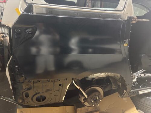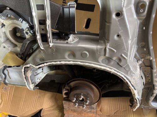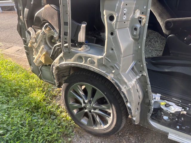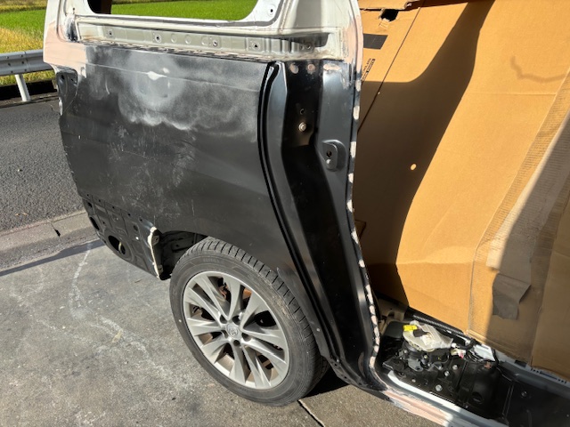 画像では簡単そうに見えますが内張を外しエアコンユニットを一部脱着、外板荒出し後重いスライドドアを外しクォーターガラスをガラス屋さんに外してもらい、ひたすらスポット溶接を削り取り等結構手間です。この後ホイールハウスを修正、新品パネルとのつじつま合わせと進みます